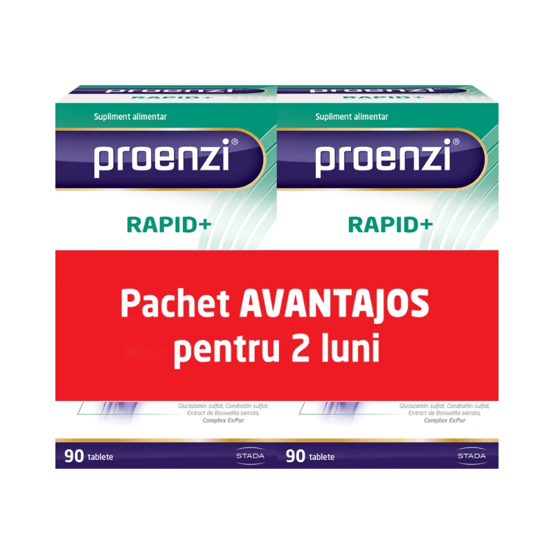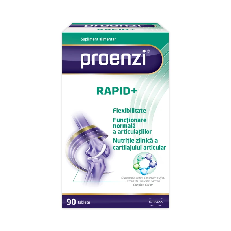 Proenzi Rapid este un supliment alimentar pe bază de glucozamină și condroitină recomandat pentru sprijinirea sănătății tuturor articulațiilor – articulațiile genunchiului, articulațiile șoldului, articulațiile mâinii și ale coloanei vertebrale
