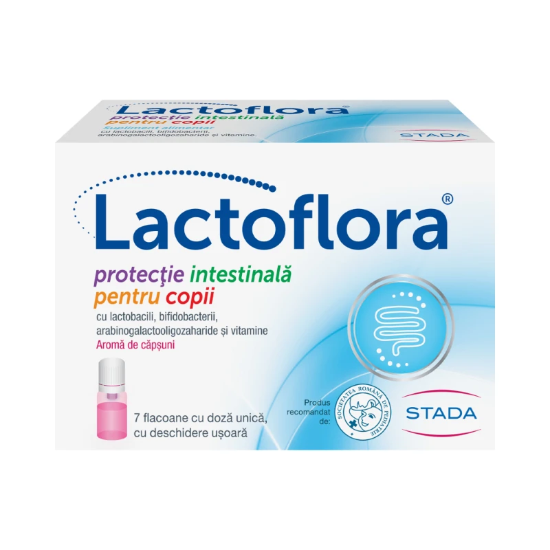 Lactoflora Protectie intestinala pentru copii cu lactobacili, bifidobacterii, arabinogalactooligozaharide si vitamine. Are aroma placuta de capsuni.